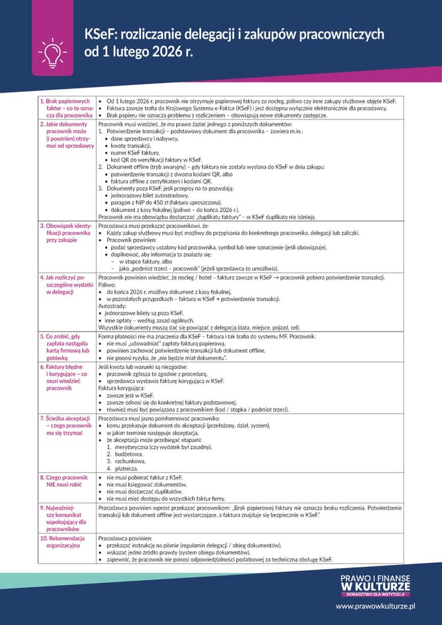 Od 1 lutego 2026 r. instytucje kultury rozliczają delegacje i zakupy pracownicze w zupełnie nowej rzeczywistości – bez papierowych faktur i bez fizycznego obiegu dokumentów. Wszystkie faktury trafiają bezpośrednio do Krajowego Systemu e-Faktur (KSeF), a pracownicy otrzymują jedynie potwierdzenia transakcji lub dokumenty zastępcze. Aby uniknąć chaosu organizacyjnego, błędów w rozliczeniach i niepotrzebnych obaw pracowników, konieczne jest jasne określenie zasad identyfikowania wydatków, przypisywania faktur do delegacji oraz ścieżek ich akceptacji. Poniższa instrukcja pokazuje, jak instytucja kultury powinna przygotować pracowników na rozliczenia po KSeF i jakie informacje należy im przekazać w praktyce.