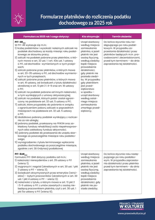 Każdy z formularzy dotyczy innego rodzaju przychodu, innego odbiorcy i ma odrębny termin złożenia. Co więcej, w przypadku zaprzestania działalności instytucji – np. zakończenia działalności projektowej lub likwidacji jednostki – obowiązki sprawozdawcze należy zrealizować jeszcze przed formalnym końcem roku.